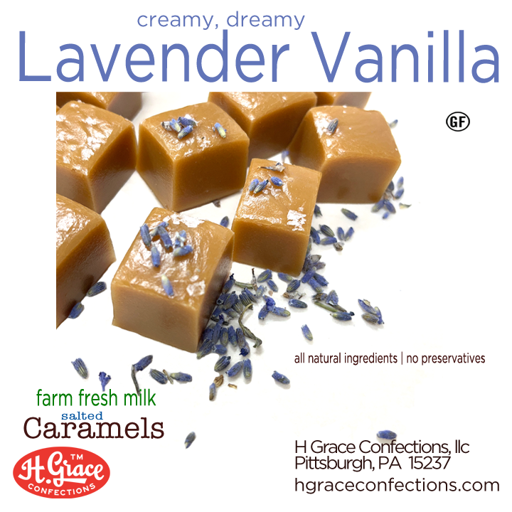 Melt in your mouth lavender infused caramel finished with vanilla.
